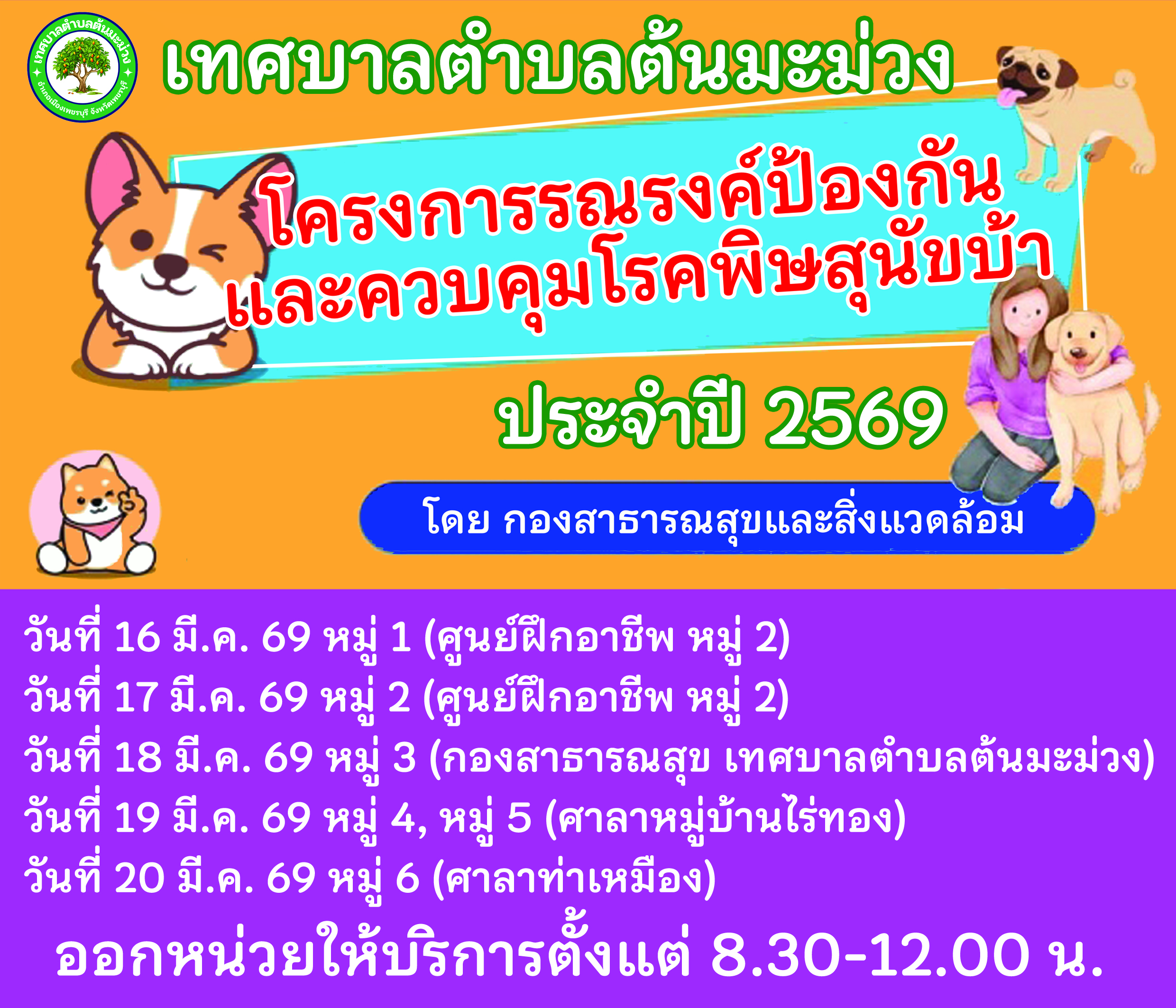 กำหนดการออกหน่วย ฉีด-รับ วัคซีนโรคพิษสุนัขบ้า ประจำปีงบประมาณ 2569 กองสาธารณสุขและสิ่งแวดล้อม เทศบาลตำบลต้นมะม่วง